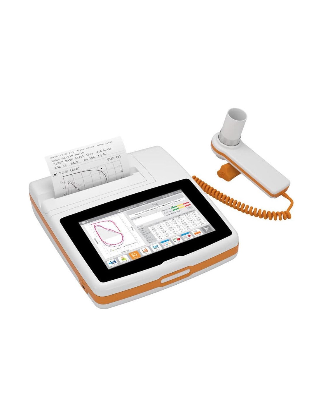 FVC, FEV1, IVC, MVV, comparación PRE/POST broncodilatador con una amplia gama de parámetros seleccionables. Batería recargable de larga duración, pantalla táctil de 7 pulgadas en color, conexión directa a impresora USB externa.Memoria10.000 pruebas de espirometría o 500 horas de registro de oximetría.