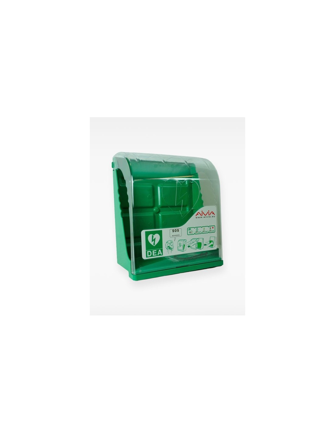 Vitrina de pared sin alarma, para desfibrilador DESA, modelo AIVIA S. Exclusivo para uso en interiores. Se caracteriza por su robustez y ligereza, el AIVIA está compuesto de dos partes bien distintas: Puerta de policarbonato transparente.. Soporte de ABS verde.
